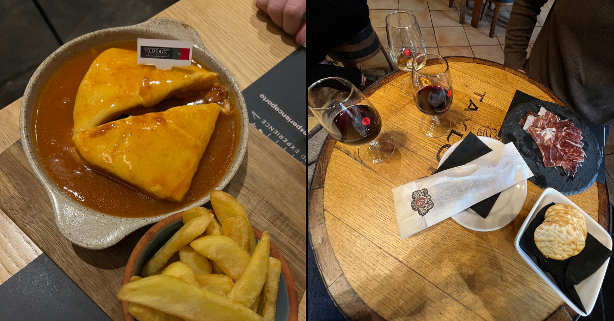 Left: Francesinha sandwich | Right: Port Wine Tasting in Vila Nova de Gaia